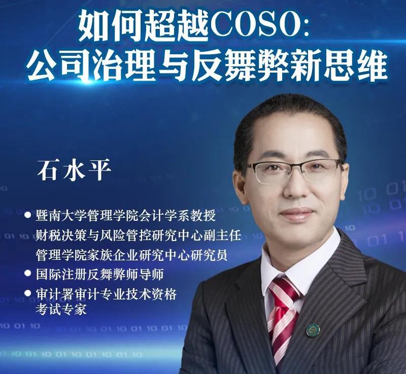 2021年09月13日swendy本期盟课堂邀请暨南大学管理学院会计学系教授、财税决策与风险管控研究中心副主任、管理学院家族企业研究中心研究员、国际注册反舞弊师导师、审计署审计专业技术资格考试专家石水平教授主讲《如何超越coso:公司治理与反舞弊新思维》