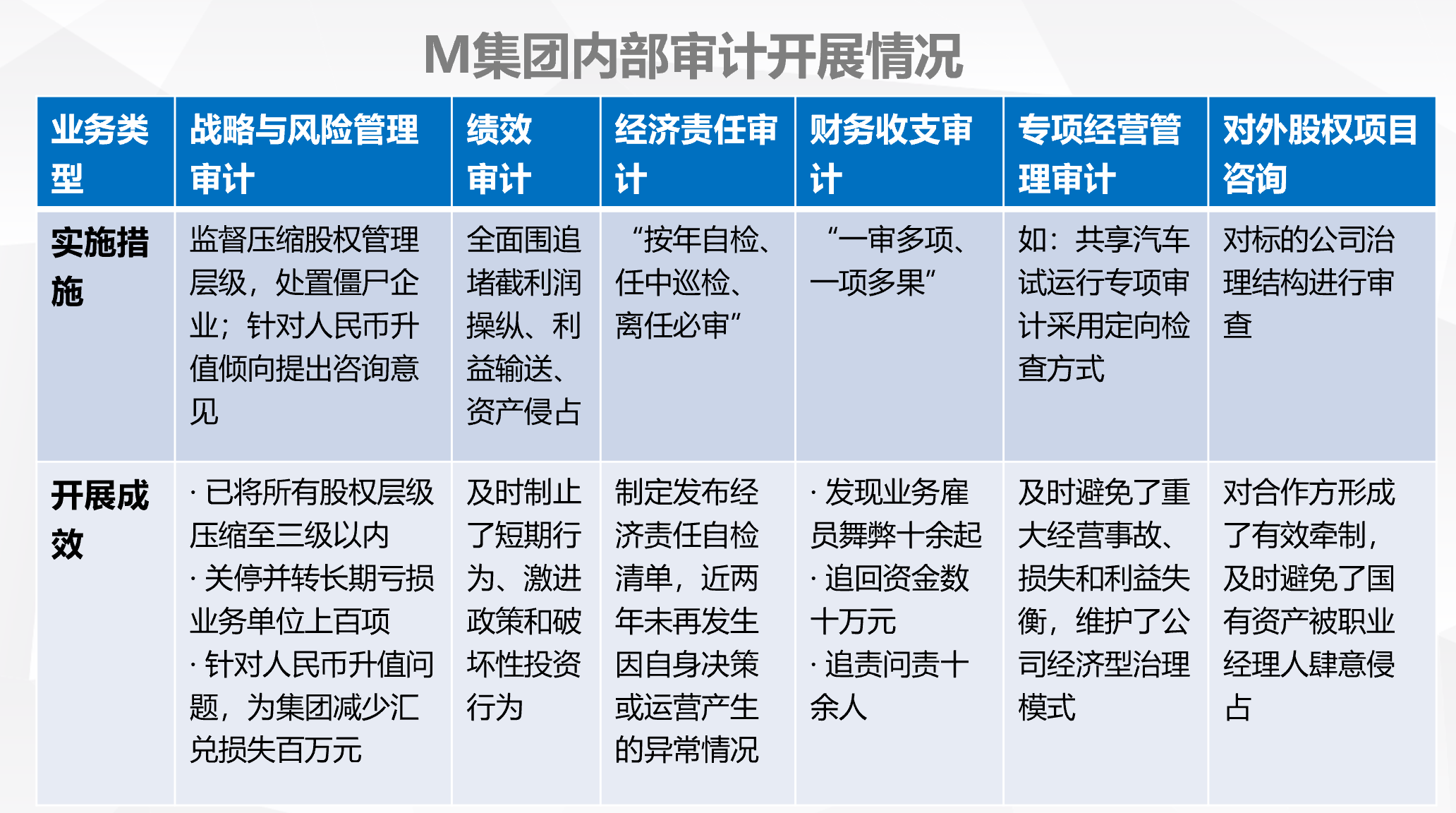 在实施战略和风险管理审计的过程中,特别强调压缩股权管理的层级处置僵尸企业;在绩效审计的过程中,要全面围堵利润的操纵,利益的输送,资金的资产的侵占;在经济责任审计过程中,结合集团的职业经理人制度来检查和发现他们利润操纵,收入操纵等问题。