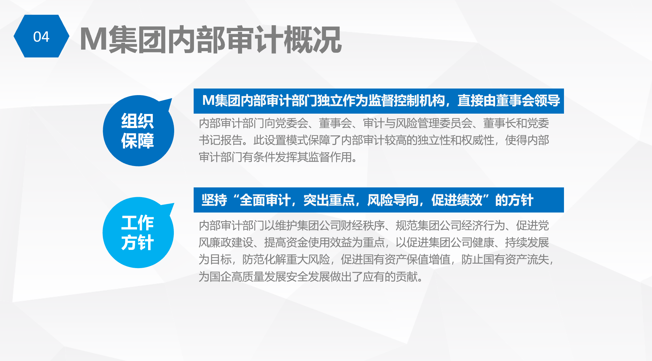 通过我们的实践,发现基于公司治理的这个利益分析,基于公司治理参与各方的一个利益的分析,通过他们所处于的阶段、模式分析他们的固有缺陷,可以提高我们内部审计发现问题的效率和效果。当然,通过m集团内部审计的案例,证明了国企改革进程中公司治理和内部审计相互促进的作用,显示出内部审计在国企改革进程中对国有资产的保护,和对国企安全发展的支持作用。内部审计和公司治理互演共生这一过程,对于国有企业重大风险的防范规避具有重要价值。