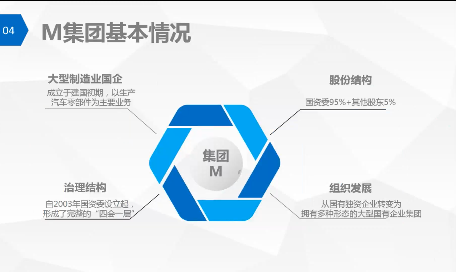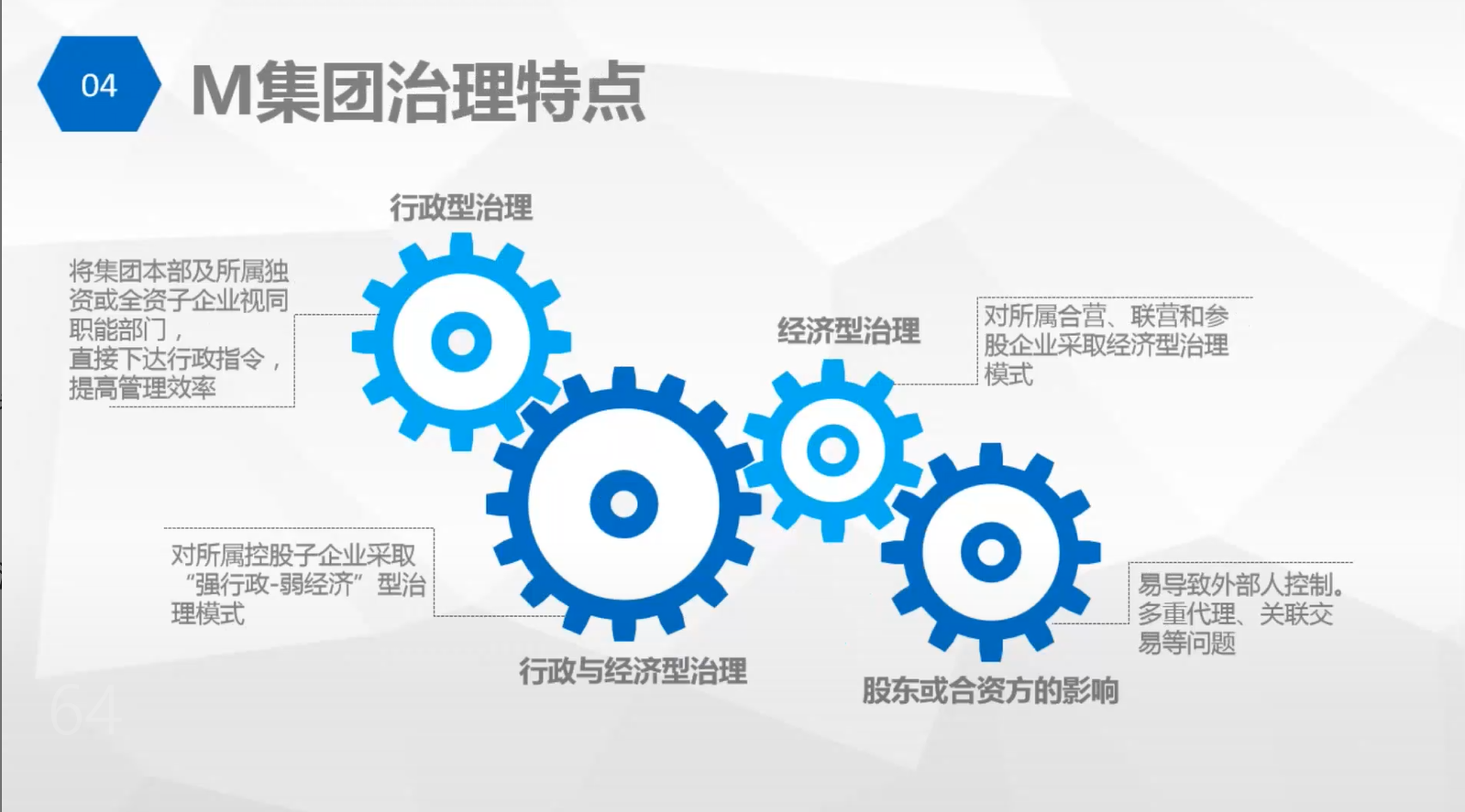m集团是四种公司治理的模式同时存在,其区分为,对于集团全资或者是独资的子企业,采取的是行政型公司治理的模式;对于与国有企业进行合资合作的,与一部分民营企业进行合资合作的,实施的是强行的弱经济型公司治理模式;对于合营、联营、参股的和对于外资的尽可能的实行完全经济型的治理模式;那么对于一些其他双方的议价能力差不多的一些合资企业,尽可能的采取弱行政,强经济型的治理模式。