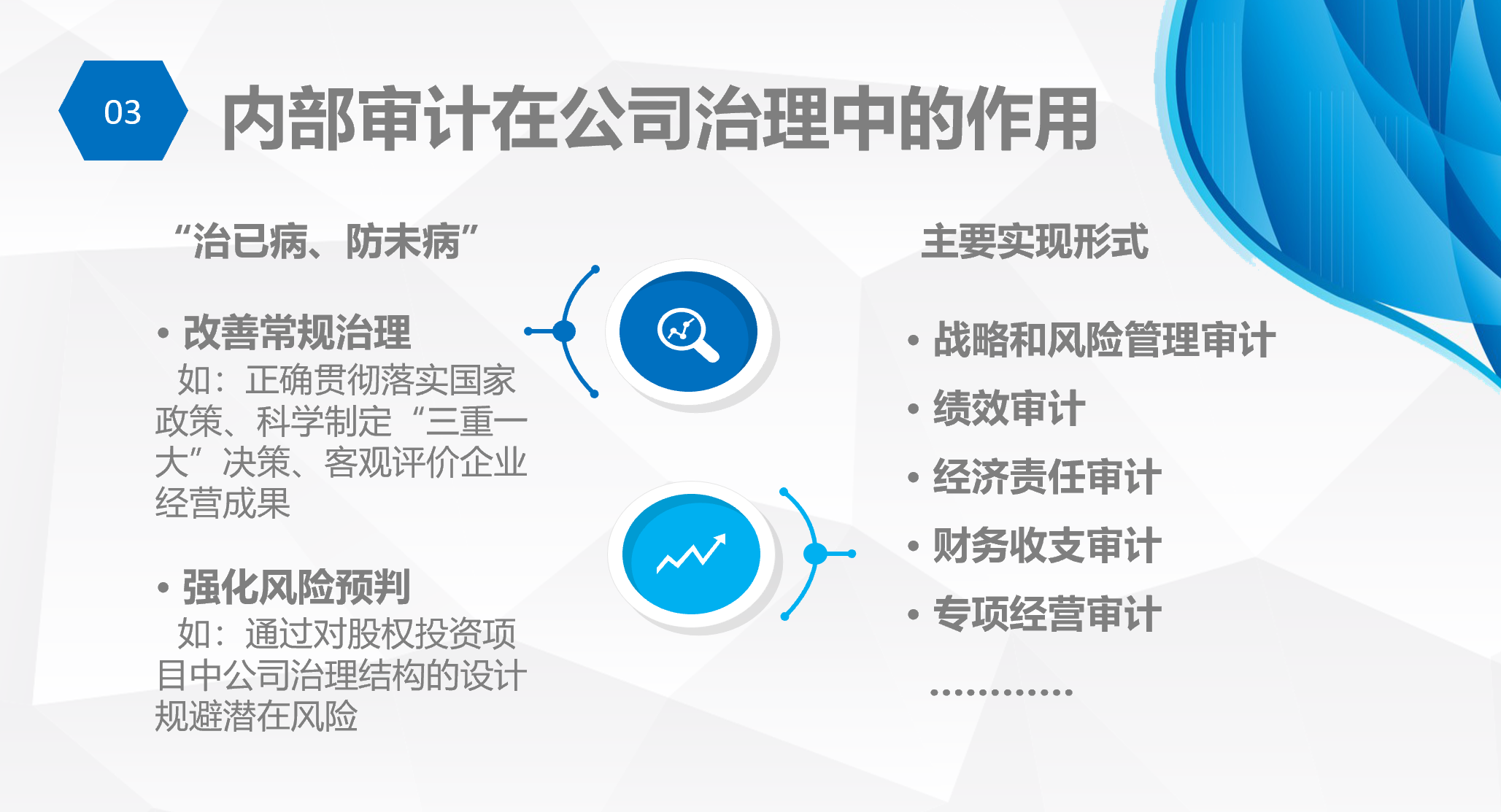 通过内部审计可以实现“治已病、防未病”的功能,改善了常规治理,强化了风险预判。其主要实现形式有:战略和风险管理审计、绩效审计、经济责任审计、财务收支审计、专项经营审计等。