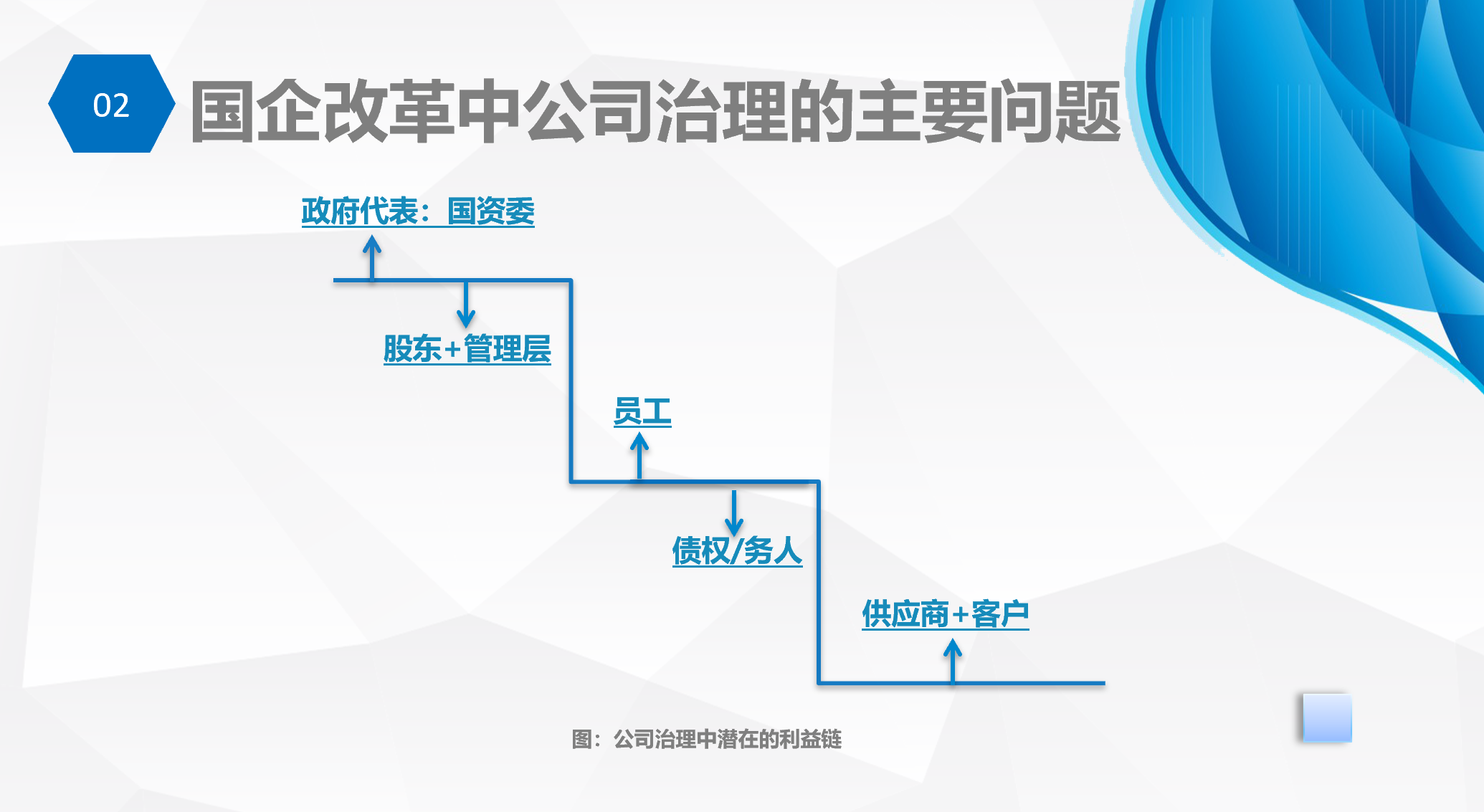 (1) 国资委:所有者缺位与多重代理问题; “一股独大”和内部人控制问题;行政干预、多重经营目标、偏向性政策与非效率性投资;