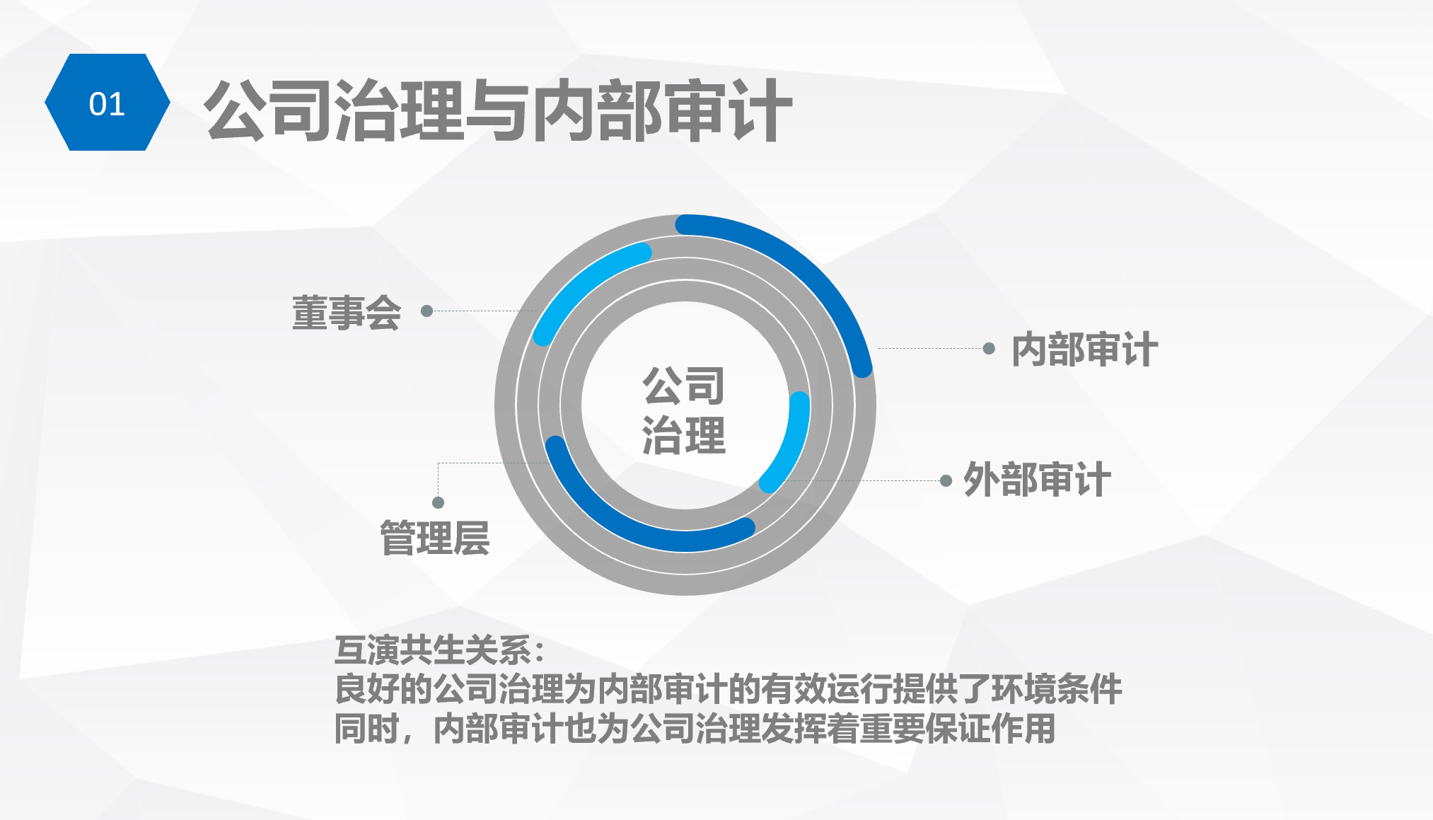 从公司治理与内部审计的关系来说,公司治理是内部审计基础环境,内部审计是公司治理的四大基石之一。公司治理和内部审计存在着互演共生关系,良好的公司治理为内部审计的有效运行提供了环境条件,同时内部审计也为公司自理发挥着重要的保证作用。内部审计是解决公司治理问题的有效手段。如常见的关联交易、同业竞争、对外担保、资金占用、不公允的转入定价、收入舞弊、利润操纵等。公司治理问题不仅仅是内部审计需要关注的,同时也外部审计需要关注和解决的。国内第一号会计准则——关联交易的出台,为了规范关联交易,遏制这类公司治理问题所带来的舞弊事件。当然,内部舞弊问题也是公司治理关注的重点,由于舞弊的专业化程度较高,因此内部审计团队中引进反舞弊人才,成立专门的反舞弊团队,或加入反舞弊联盟共治共建也越来越常见。