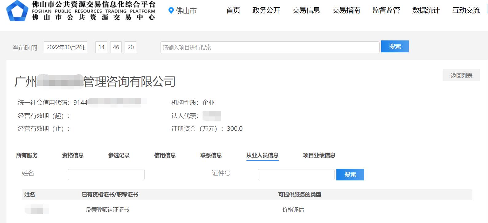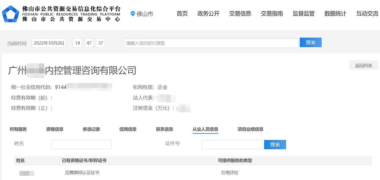 反舞弊师证书已被佛山市公共资源交易中心平台收录