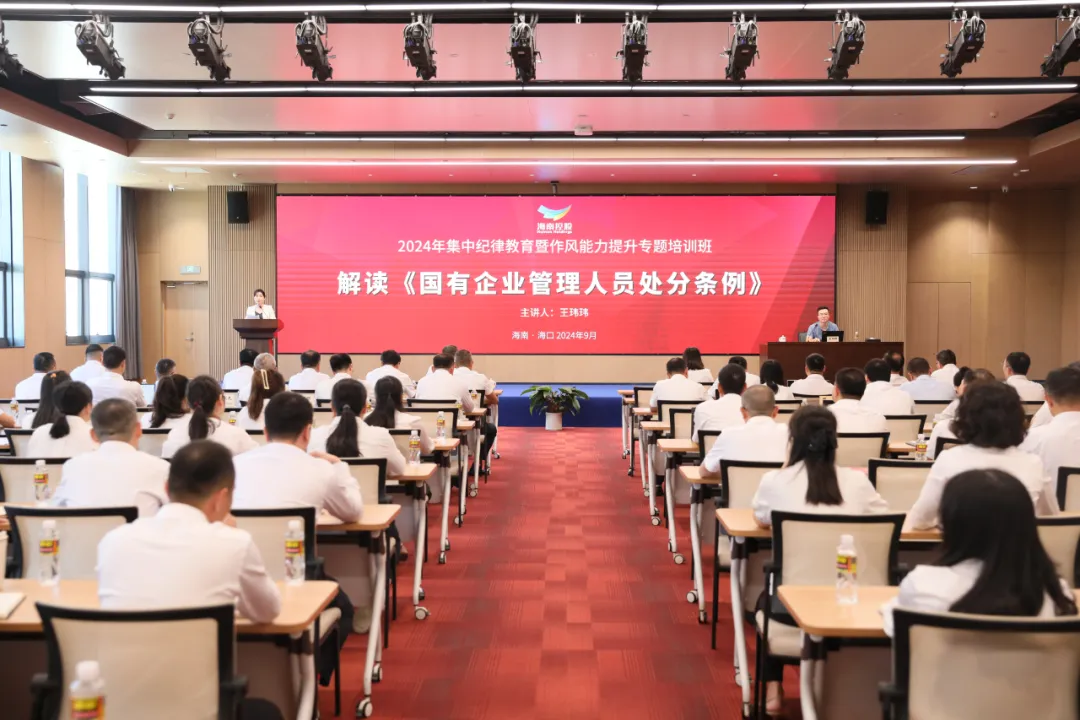 为深刻领会习近平新时代中国特色社会主义思想,贯彻落实党的二十大、二十届中央纪委三次全会以及省委八届四次、五次全会精神,巩固深化党纪学习教育成果,筑牢党员领导干部纪律规矩意识,进一步推动清廉自贸港建设和清廉国企建设走深走实,9月25日,海南控股举办2024年集中纪律教育暨作风能力提升专题培训班,邀请中央纪委国家监委驻中央港澳工作办公室纪检监察组副组长、海南省纪委常委冷葆青,海南省纪委监委案件审理室二级主任科员王玮玮授课。海南控股党委书记、董事长周军平及领导班子成员参加学习。
