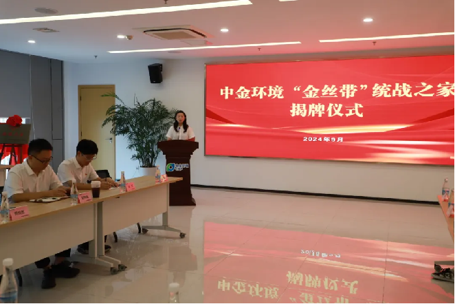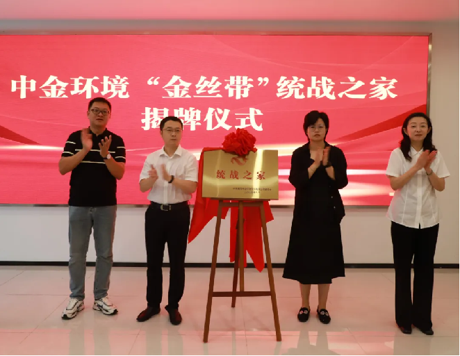 随后,团市委副书记钱月霜、市侨联办公室主任毛叶平,中金环境党委书记、工会主席许健,经开区信成花园社区党总支书记沈辰栋共同为中金环境“金丝带”统战之家揭牌。