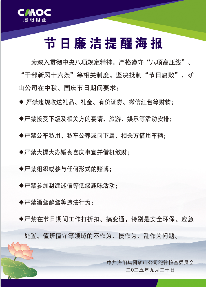 近日,矿山公司印发《关于加强2025年中秋及国庆期间廉洁自律工作的通知》,就确保全体干部职工度过一个欢乐祥和、风清气正的“双节”提出明确要求,进一步严明纪律规矩,强化正风肃纪。