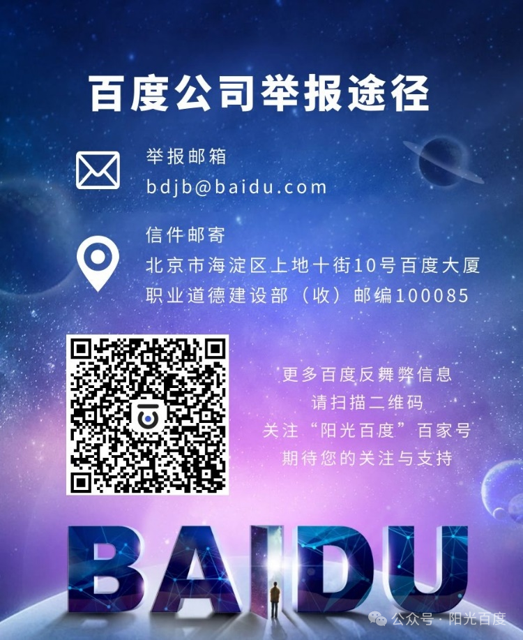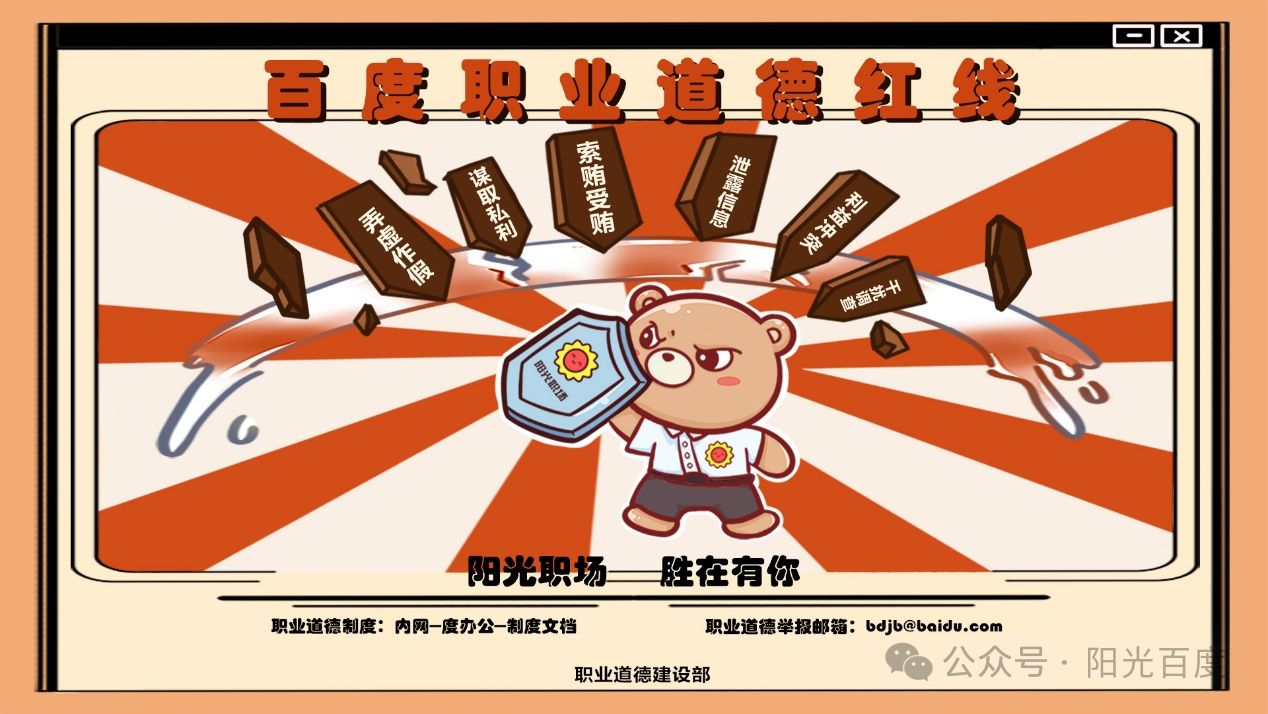 百度一直秉承“风清气正、诚实守信”的文化价值观,百度职业道德红线也是百度全体员工践行的行为准则。